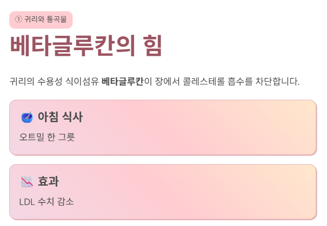 귀리에 풍부한 수용성 식이섬유인 '베타글루칸'은 장에서 콜레스테롤 흡수를 차단해 수치를 낮추는 데 일등 공신입니다. 아침 식사로 오트밀 한 그릇, 어떠신가요?