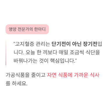 "고지혈증 관리는 단기전이 아닌 장기전입니다. 오늘 한 끼 건강하게 먹었다고 안심하기보다, 매일 조금씩 식단을 바꿔나가는 것이 핵심입니다. 가공식품을 줄이고 자연 식품에 가까운 식사를 하세요."