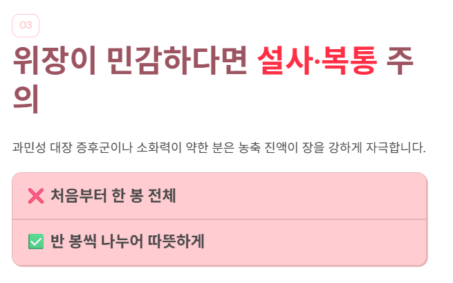 이런 분들은 처음부터 한 봉을 다 마시지 말고 반 봉씩 나누어 따뜻하게 데워 마시며 적응 기간을 가져야 합니다.